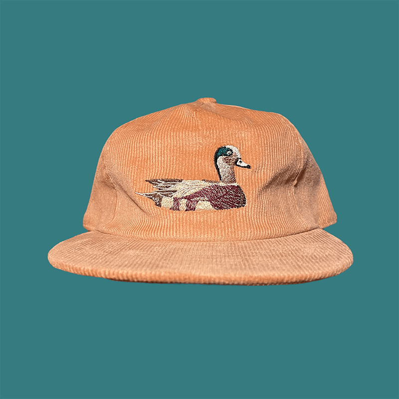 This hat is made of 100% corduroy and is designed to showcase the beautiful wigeon, with its distinctive green stripe. Embroidered on the front is a swimming wigeon, giving the hat a timeless and vintage appearance. On the back, there is a green embroidery featuring the slogan 'Be Different, Be You,' matching the facial features of the bird on the front of the hat. Just below the slogan, you'll find a brass clip that secures the adjustable strap, allowing for multiple sizing options. Make a statement at your next gathering with this hat.